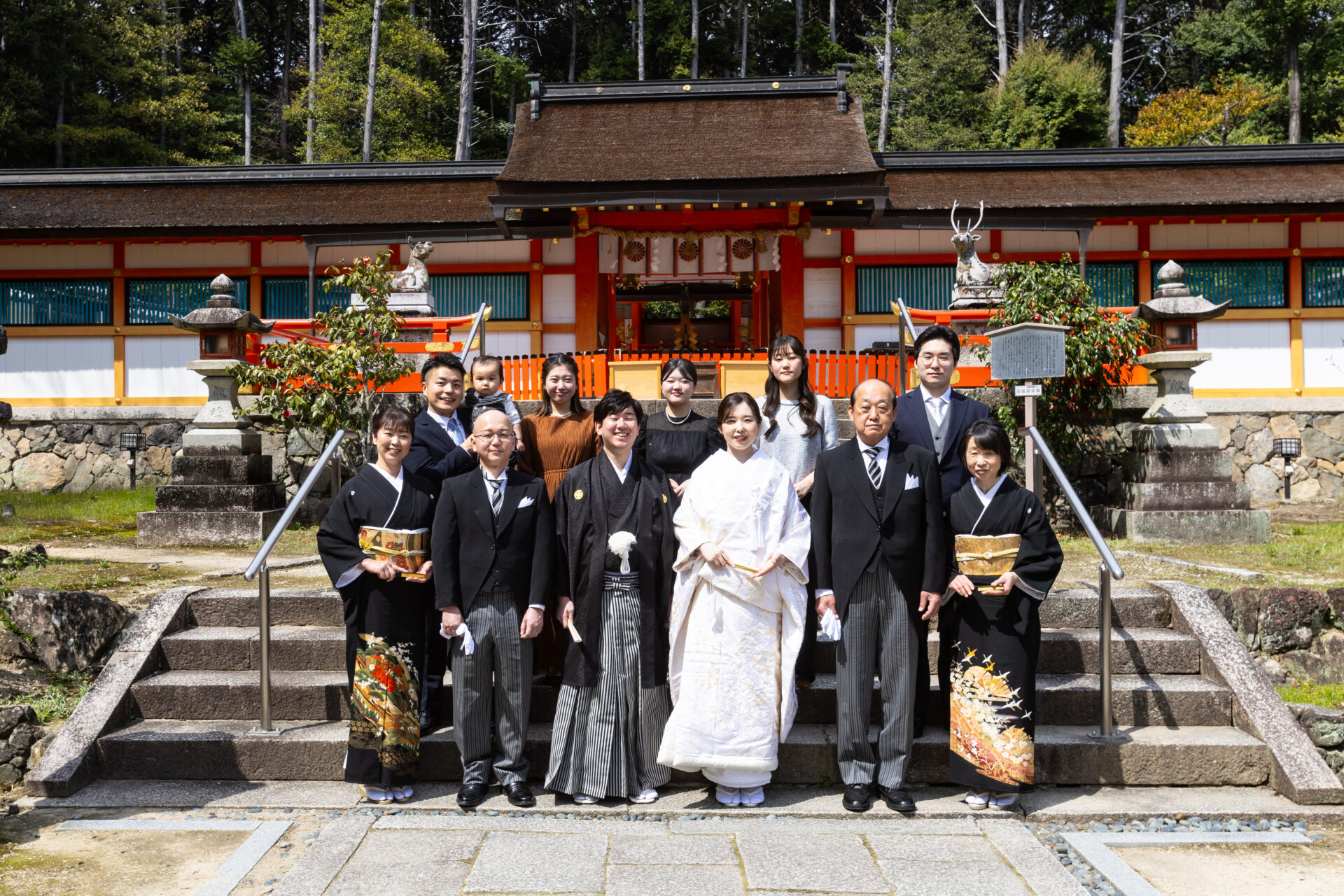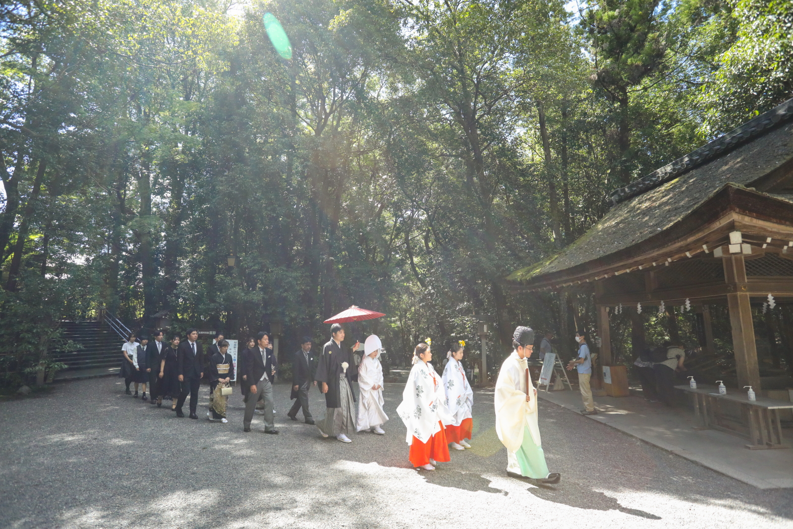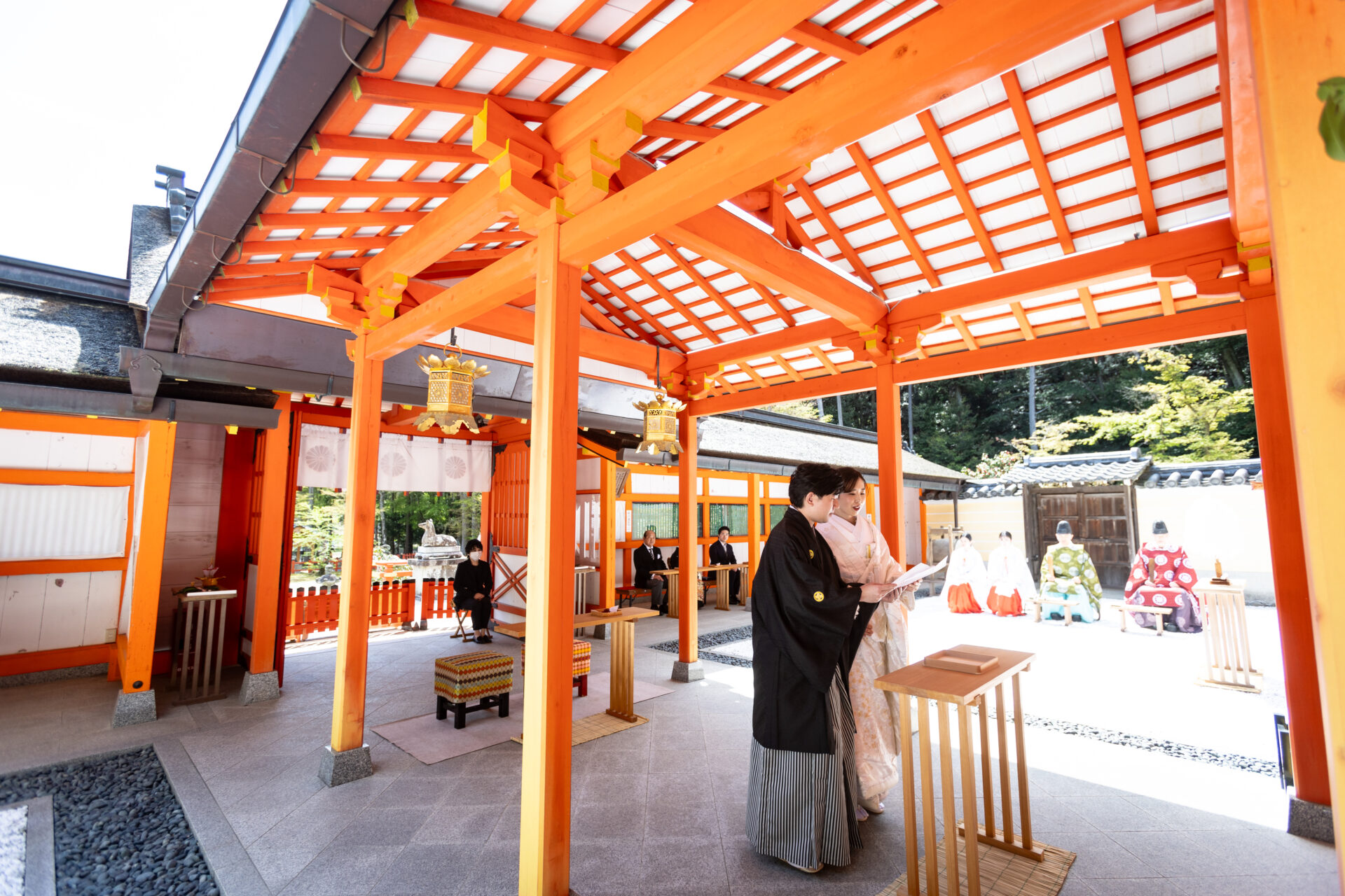 ・神社での結婚式は家族と親族だけで行います。友人も参列できる神社もありますが、本殿や儀式殿の外から挙式をの様子を見てもらうこともあります。